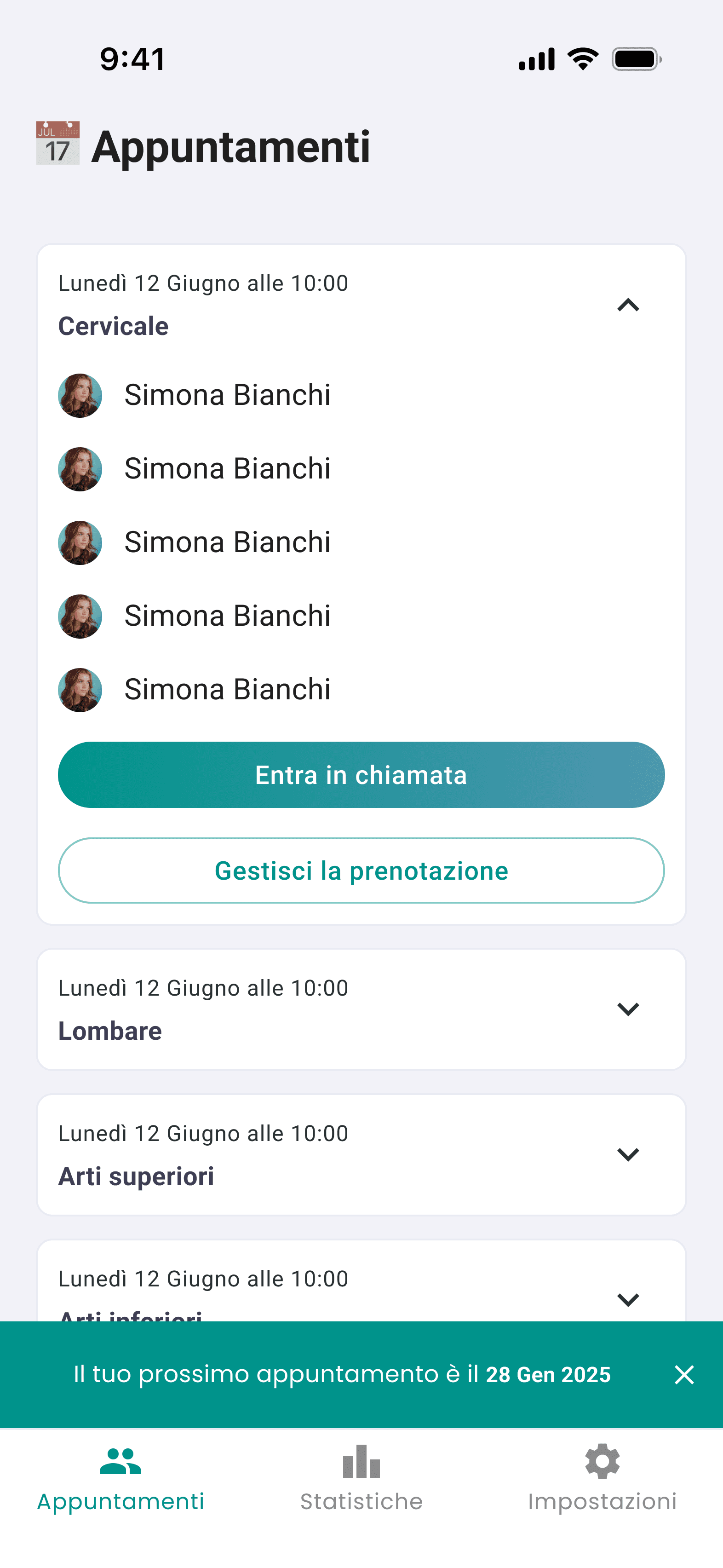 Unification of processes — rehabilitation pathways, live sessions, asynchronous activities, and communications — into a single traceable hub. Greater therapeutic adherence thanks to reminders, daily tips, and pain monitoring, resulting in increased engagement. Improved operational efficiency through "self-service" availability, economic management, and mass notifications, reducing the clinical team's manual workload. Finally, maximum data transparency thanks to shared dashboards that aggregate clinical performance.